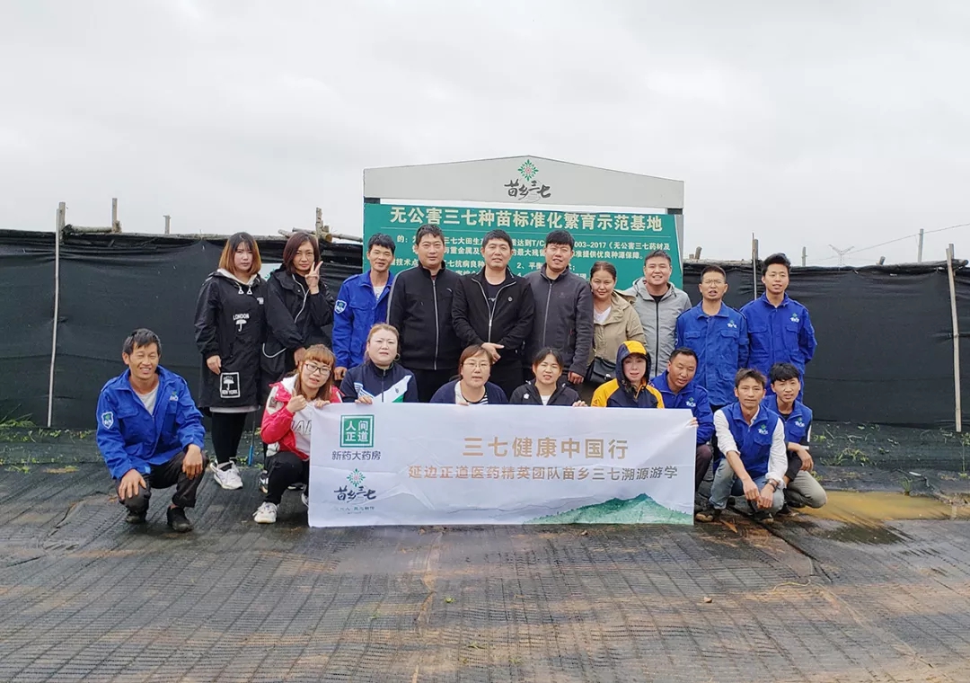 延邊正道的精英團(tuán)隊(duì)在苗鄉(xiāng)無公害三七種苗繁育基地前合影