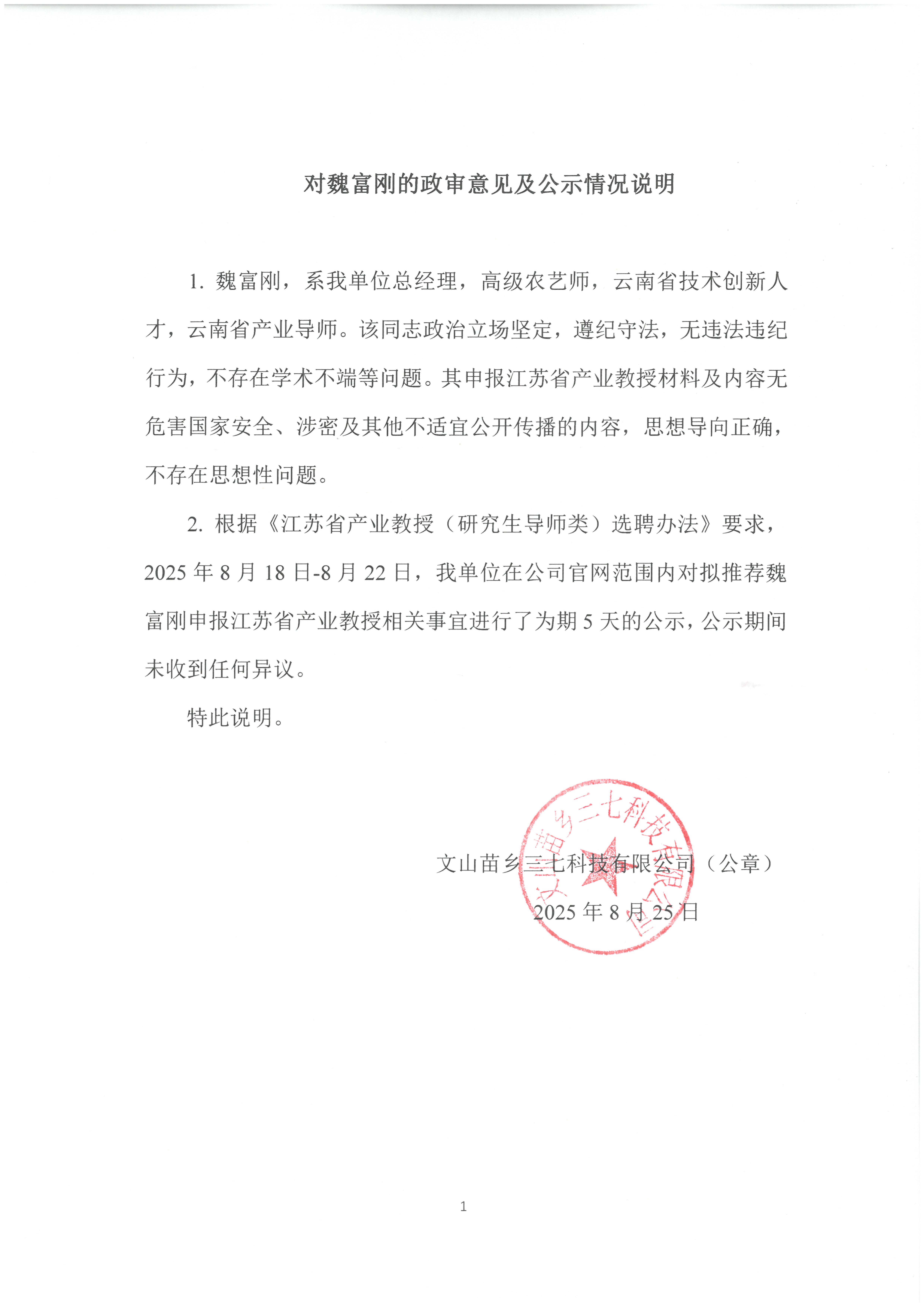 魏富剛,系我單位總經(jīng)理,高級農(nóng)藝師,云南省技術(shù)創(chuàng)新人才,云南省產(chǎn)業(yè)導師。該同志政治立場堅定,遵紀守法,無違法違紀行為,不存在學術(shù)不端等問題。